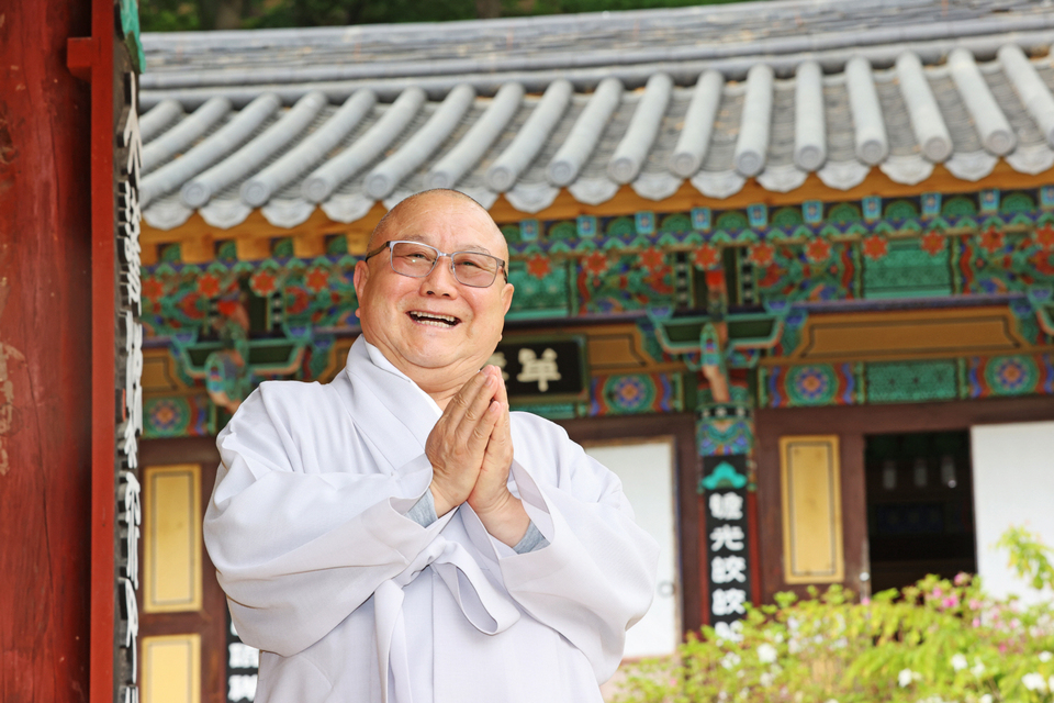 은해사(銀海寺)에서 진행된 경북일보와의 인터뷰 전 법당 앞에서 합장을 하고 환하게 미소를 짓고 있다. 사진 출처:경북일보https://www.kyongbuk.co.kr/news/articleView.html?idxno=2076375